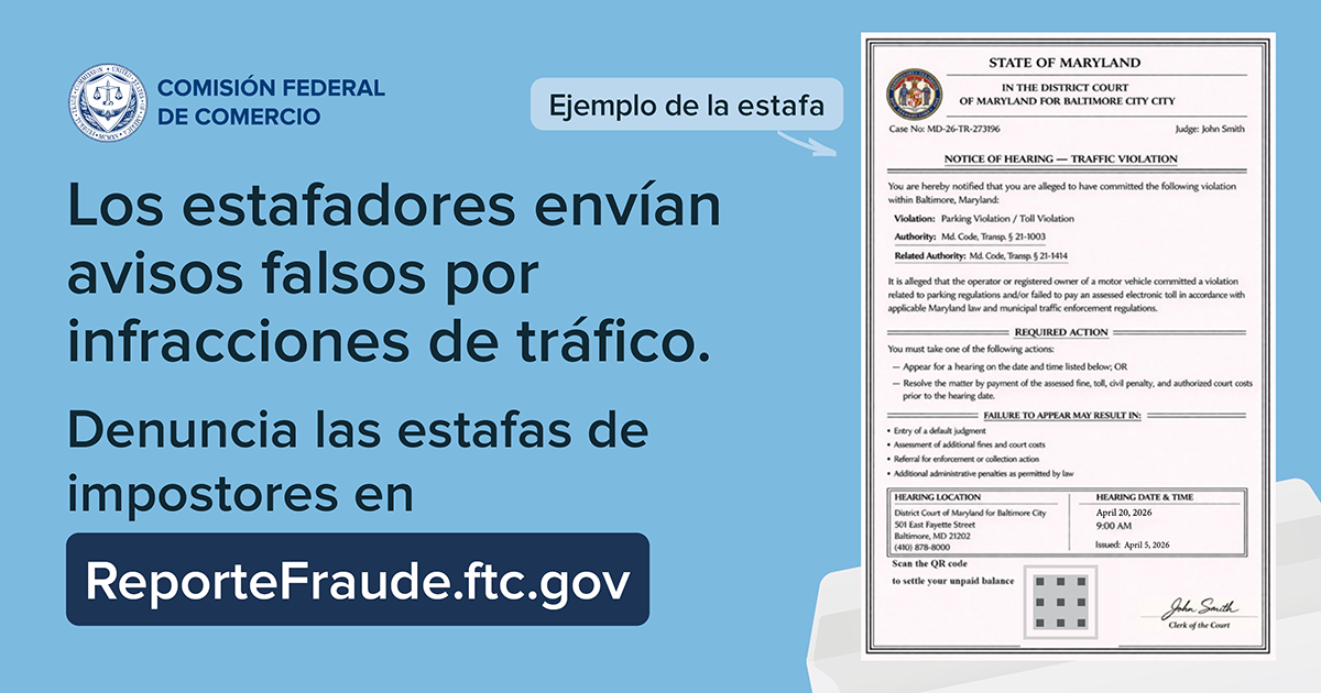 ¿Recibiste un mensaje de texto con una imagen de lo que parece ser una notificación oficial de una audiencia por una infracción de tránsito? No estás solo. La FTC ha observado un aumento considerable de reportes sobre esta estafa por mensaje de texto durante el último mes. Esta es solo la historia más reciente de cómo los estafadores intentan robarle el dinero a la gente. Así es como funciona esta estafa y cómo evitarla.