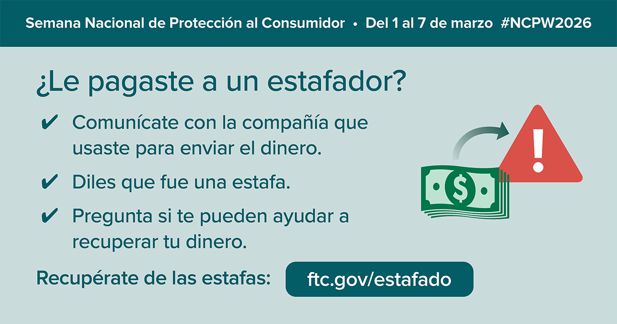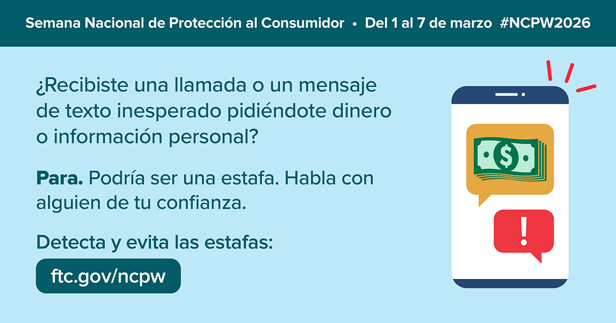 ¡Es la Semana Nacional de Protección del Consumidor! Visite ftc.gov/ncpw [O su sitio web de consejos para consumidores] para obtener información sobre cómo evitar, reportar y recuperarse de las estafas. #NCPW2026