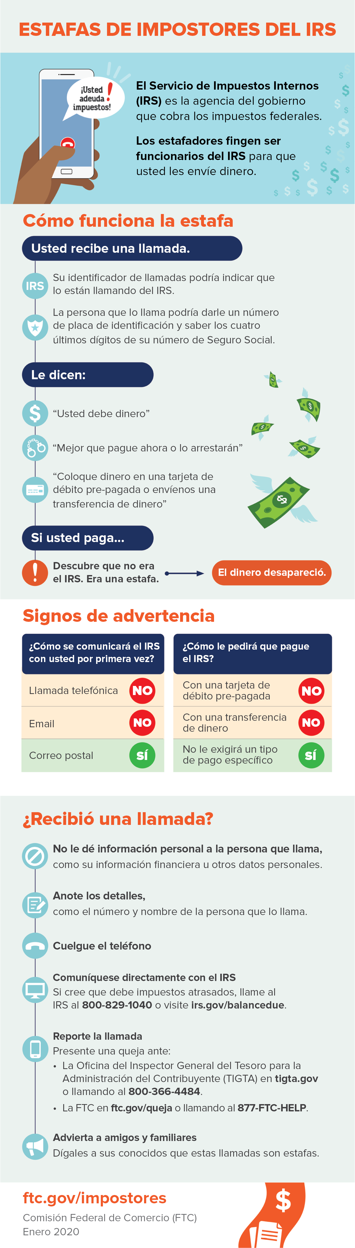 Los impostores que simulan trabajar para el IRS son aquellos que fingen estar llamando de parte del IRS. Le dicen que adeuda impuestos y le exigen que les pague de inmediato, habitualmente, con una tarjeta de regalo o una tarjeta de débito pre-pagada. Lo amenazan diciendo que, si no paga, lo arrestarán o enfrentará otras consecuencias graves. Pero todo eso es mentira. Si les envía dinero, el dinero desaparece.
